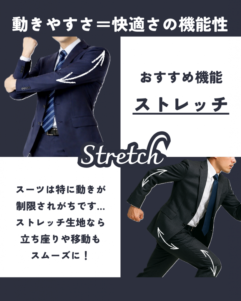 一般的なスーツ生地は伸縮性が少なく、動きが制限されがちですが、ストレッチ素材なら、立ち座りや移動もスムーズ。